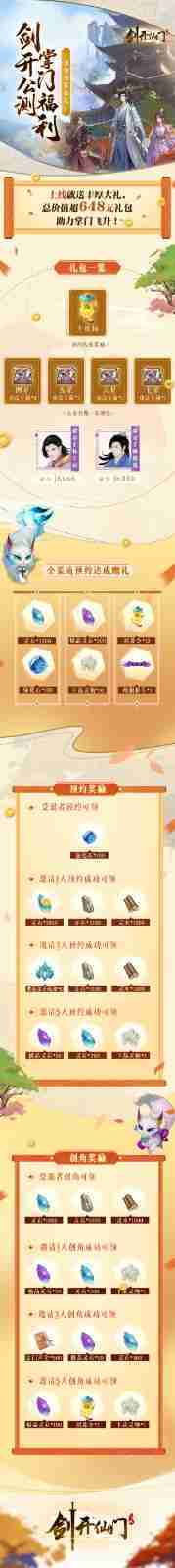 游戏为大家准备了海量的福利,,包括上线即可获得的全渠道预约礼包、、十连抽等福利,,,输入密令“JK666”、、、、“JK888”即可领取紫色弟子,,达到金丹期后还有功法宝箱可领,,,,助力全宗上下实力提升……所有奖励总价值超过648元,,,而邀请好友一起体验,,更可以获得额外的奖励哦~