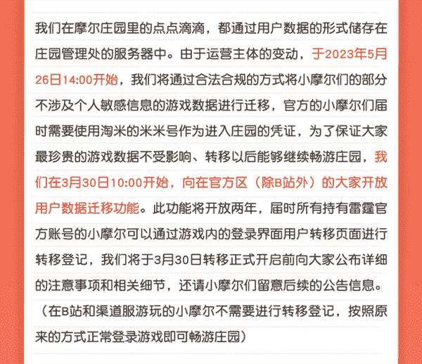 合作结束本就是开发方和代理方双方的事情,,,,降低这件事情对玩家的影响,,,才是对所有珍视这段童年的摩尔玩家最好的呵护。。目前看来,,,用户完全不用担心后续因无法登录游戏而造成任何数据上的损失,,,只要及时进行账号转移,,就可以好好保留、、、、延续在庄园的痕迹和回忆,,,,继续在庄园里做快乐的红鼻子小鼹鼠。。。