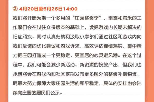 合作的结束并不意味着这个童年IP的结束,,,对于《摩尔庄园》手游而言,,,,这是一个新阶段的开始。。后续游戏内将开启庄园重构计划,,,,会就以往遗留下来的BUG进行集中修复,,,并在游戏内和社区定期发布更多补偿物资。。